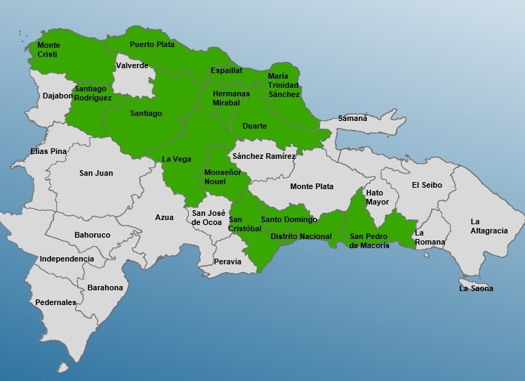 Las provincias que se encuentran en alerta verde son: Puerto Plata, Duarte, Montecristi, Monseñor Nouel, Espaillat, La Vega, Hermanas Mirabal, Santiago, San Cristóbal, Santiago Rodríguez, San Pedro de Macorís, María Trinidad Sánchez, Santo Domingo y Distrito Nacional.